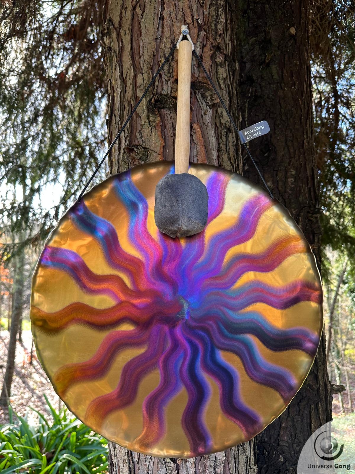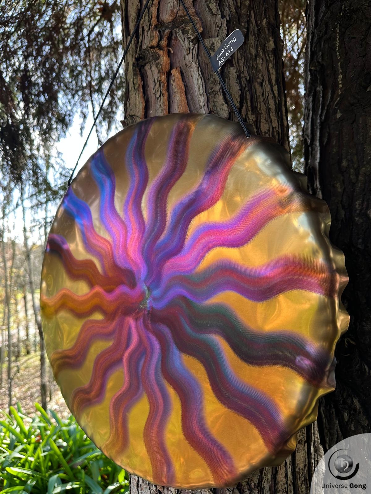 Details Gong : Handheld Gong / Aura Gong - AG-614Gong Reference AG-614Size Universe Gong 50 cms / 20.0 in iNote / FrequencyA#2 - 114.5 HzWeight1.80 Kg / 3.97 lbPrice€ 299Shipping cost iFreeStrike MalletIncluded